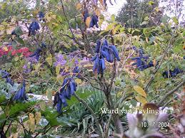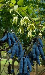 Mais l'originalité de cet arbuste est sa fructification automnale, en effet ses fleurs donnent des grosses gousses bleues tombantes qui ressemblent  à des gros haricots avec son feuillage qui devient jaune intense qui offre un contraste entre ce bleu et ce jaune.